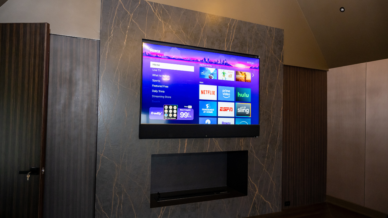 Mounted TV over fireplace in seating area.