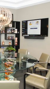 Television is properly sized for this conference room, which also features a unique bottle-based table displaying Alltech’s wares.